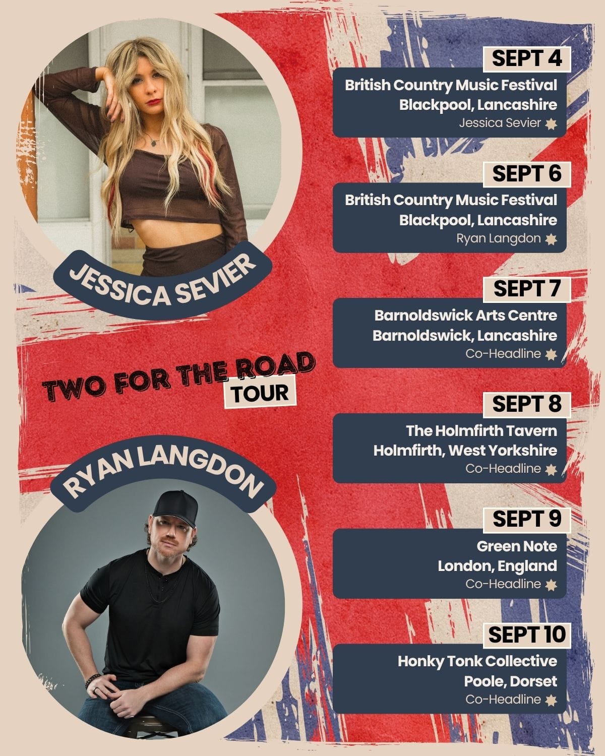 I'm so excited to announce my first tour in the UK. This is going to be a co-headline tour with the amazing Jessica Sevier, starting off in Blackpool at the British Country Music Festival, then visiting Barnoldswick, Holmfirth, London, and Poole.